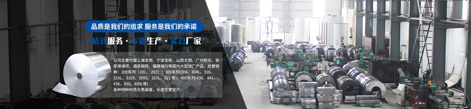 公司主要代理上海宝钢、宁波宝新、山西太钢、广州联众、张家港浦项、酒泉钢铁、福建福欣等国内大型钢厂产品,经营钢种:200系列(201、 202);300系列(304、304L、316、316L、310S、309S、317L、321 等);400系列(430、441、436、439、409L等)。